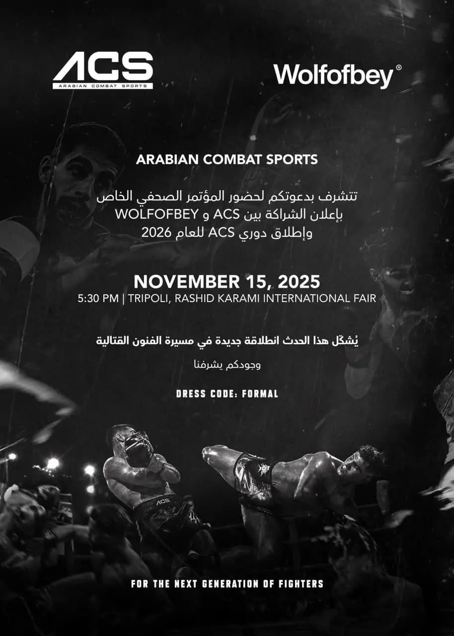 يُوقّع رئيس منظمة “أرابيان كومبات سبورتس”(ACS) وليد عجاج ورئيس مجلس ادارة “وولف أو باي”Wolfofbey )) جاد فاكهاني اتفاقية شراكة بينهما خلال مؤتمر صحافي سيُعقد عند الساعة 5.30 من مساء السبت المقبل الواقع في 15 تشرين الثاني الجاري في “معرض رشيد كرامي الدولي” في مدينة طرابلس بحضور فاعليات رسمية، عسكرية، بلدية،اقتصادية ،رياضية ،اداريين،مدربين،لاعبين ورجال الصحافة والاعلام.وخلال المؤتمر الصحافي، سيتم الاعلان عن دوري “أرابيان كومبات سبورتس” لعام 2026 والذي ستقام مراحله في العديد من المناطق اللبنانية.