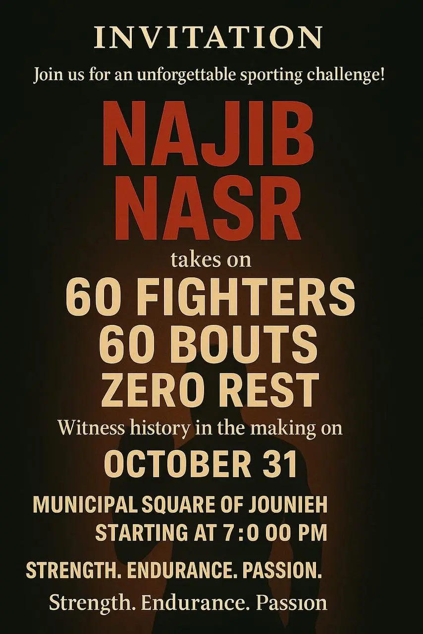 في خطوة هي الأولى من نوعها، سيخوض بطل الملاكمة الفرنسية(سافات) المخضرم نجيب نصر ستين نزالاً ابتداء من الساعة السابعة من مساء الجمعة 31 تشرين الأول الجاري امام مبنى بلدية جونيه. وفي التفاصيل، وفي ذكرى اطفاء شمعته الستين، راودت نصر، بطل العالم في الملاكمة الفرنسية(سافات) عام 1995 ، في البطولة التي جرت في العاصمة الفرنسية باريس، منذ فترة فكرة مواجهة 60 ملاكم وملاكمة على مدى ساعة بحيث سيخوض نصر نزالاً مع كل منهم مدته دقيقة واحدة في مشروع اراد نصر تطبيقه في اواخر الشهر الجاري.ويقول نصر” لقد خطرت فكرة مواجهة 60 ملاكماً وملاكمة تباعاً وتوالياً و تدرّبت على هذا الامر في مدينة ستراسبورغ الفرنسية في شهر أيلول الفائت ونجحت في الاختبار”.واضاف نصر “سيشارك في هذه الأمسية العديد من ممارسي الملاكمة الفرنسية من لبنان وفرنسا .وسيصل الملاكمون والملاكمات الفرنسيون الى لبنان في 29 تشرين الأول الجاري للمشاركة في هذه الأمسية الجميلة التي ستدوم ساعة باعتبار أنني سألاكم كل لاعب ولاعبة دقيقة واحدة امام جمهور يحب الرياضة عامة والرياضات القتالية خاصة وسط اجواء احتفالية “.وتابع نصر، المعروف بعشقه لرياضات التحمّل وحامل القاب عديدة محلية ودولية ،”أتدرب يومياً لتطوير لياقتي البدنية وسيتم انشاء حلبة ملاكمة في الباحة الخارجية لمقر بلدية جونيه لخوض النزالات .أدعو الراغبين بمشاهدة هذه النزالات الى الحضور الى باحة بلدية جونية مساء الجمعة 31 تشرين الأول الجاري ومواكبة هذا الحدث الفريد من نوعه والدخول مجاني .وأود بهذه المناسبة ان أشكر المجلس البلدي لجونيه على تقديم التسهيلات لاقامة هذا الحدث وكل من سيساهم في انجاحه ومنهم رجال وسيدات الصحافة والاعلام.