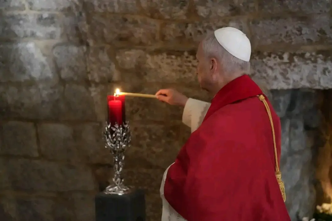 وفور الوصول أمام الضريح على وقع الألحان الروحيّة السريانيّة المارونيّة التقليديّة، جثا قداسة البابا لاون مصلّيًا بصمت خاشع أمام الضريح، قبل أن يضيء شمعة مباركة قدّمها للدير.